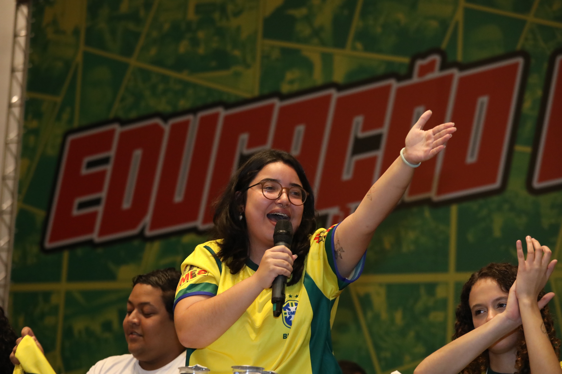 Valentina Macedo fez um balanço sobre a gestão e afirmou que os estudantes defenderam a educação a todo o momento. “Esse congresso já é uma grande vitória com diversos estudantes vestindo verde e amarelo e eu acho que isso reflete um pouco do que foi a nossa luta nessa última gestão. A gente entra no auge do governo Tarcisio e Feder e também começamos a enfrentar os principais ataques deles contra a educação”, disse.