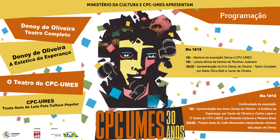 19h – Apresentação dos livros Denoy de Oliveira – Estética da Esperança, por Xavier de Oliveira e Carlos Lopes e O Teatro do CPC-UMES, por Roberta Carbone e Rebeca Braia